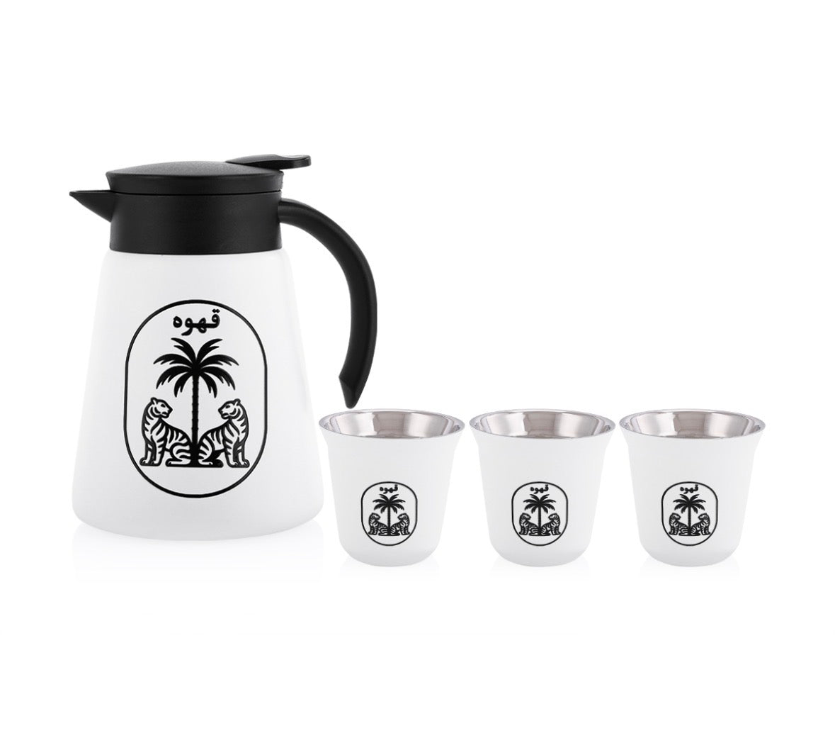 طقم حافظة قهوه مع اكواب لون ابيض بنقشة لون أسود