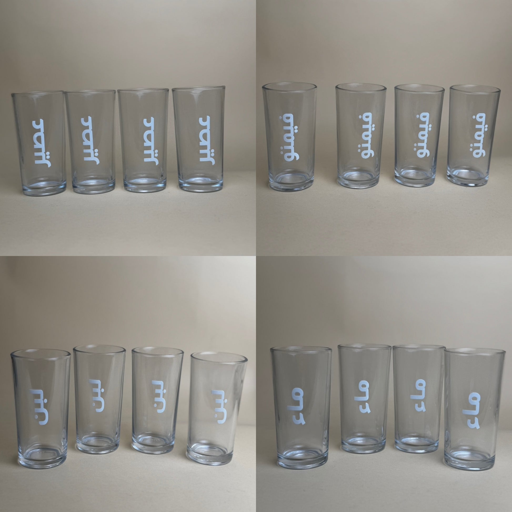 طقم اكواب زجاج ٤ حبات بعبارة ( ماء / لبن / عصير / فيمتو/ هني وعافية)